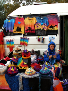 A very bright eclectic display of painted clothing, hung all around a small white bus, with a woman rugged up against the late afternoon chill winds, crocheting hats.